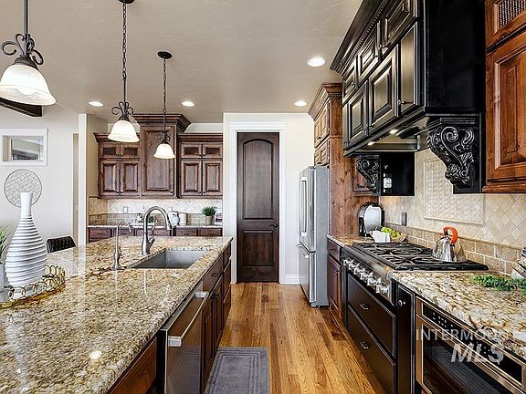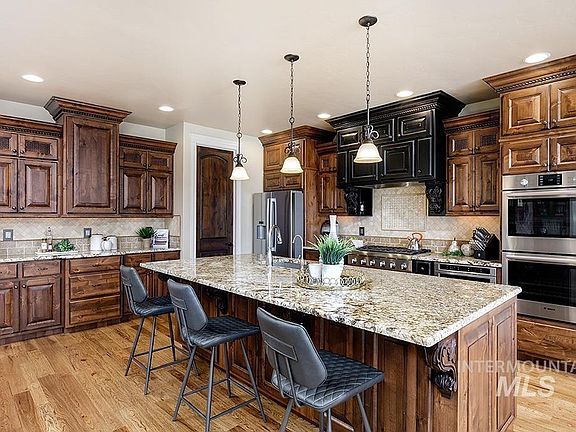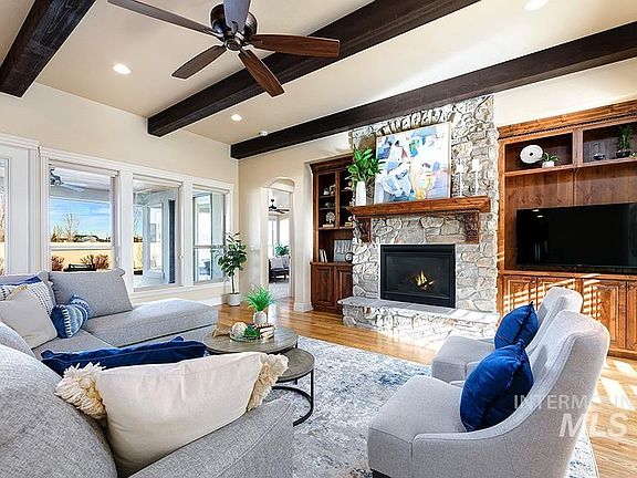 A refined single-level with impressive scale, sophisticated architecture, and a great central Meridian location! The stately stucco and stone exterior opens up to a bright open floor plan with a fabulous flow for everyday living and entertaining. Rich architectural details provide a luxury appeal, as exposed wood beams, custom millwork, and a floor-to-ceiling stacked stone fireplace add depth against the neutral palette. The gourmet kitchen opens up behind a lengthy entertaining island with breakfast bar seating and plenty of room to gather. The kitchen is outfitted with top-of-the-line built-in appliances, featuring a Bosch® refrigerator & dual ovens, and a Thermador® gas stovetop and dishwasher. A split-bedroom layout sets the primary suite apart, complete with direct patio access, tray ceilings with ambient rope lighting, and a spacious en suite bathroom/walk-in closet.