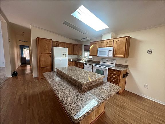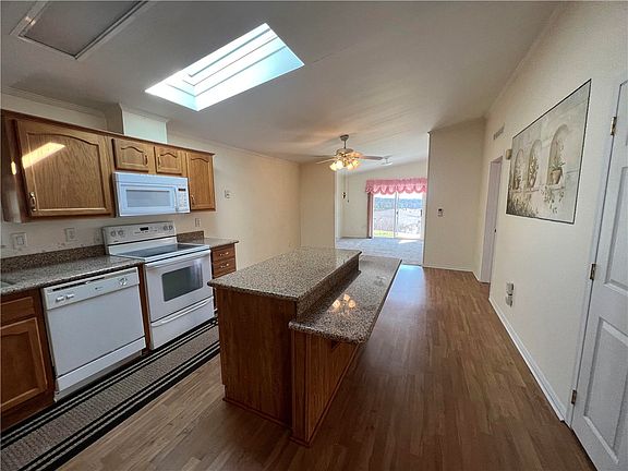 Welcome to 39244 Shamrock Ct!  As you enter the spacious 2 bedroom 2 bathroom home, you are met with a large living room and a stone fireplace with track lights.  From the living room you will flow right into the kitchen which boasts granite countertops, a skylight, and an island.  Moving on to the primary bedroom you will find the en suite bathroom which also has a skylight, soaking tub, and double vanity.  Entering the den, you will find sliding glass doors that will lead you onto the relaxing patio with a stunning view of the sunset.