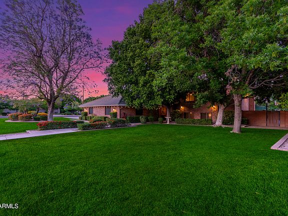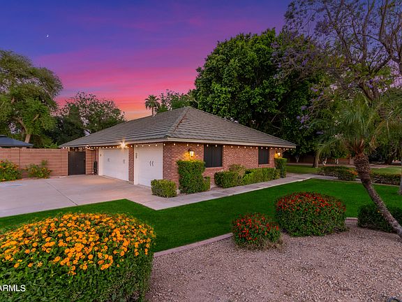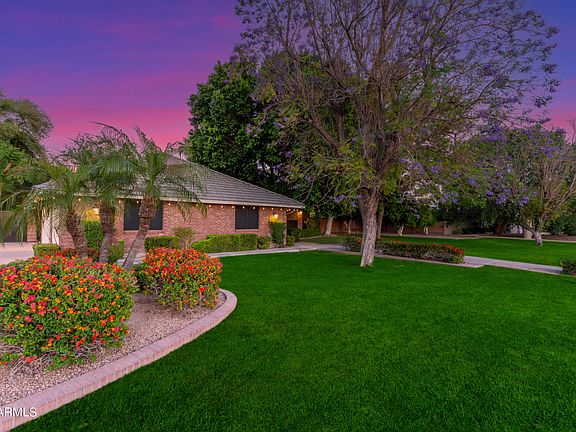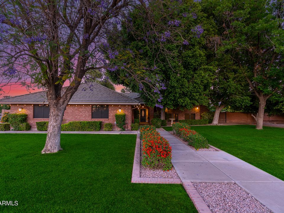 Refined luxury awaits in this enchanting all-brick abode nestled within a serene park-like oasis. Situated on a sprawling 35,000+ sq ft corner lot in a picturesque neighborhood. The grandeur of the great room is accentuated by vaulted ceilings, offering panoramic views of the inviting pool and lush backyard. Culinary delights await in the gourmet kitchen, equipped with a 48-inch Viking gas range w\griddle, GE Monogram wall oven, Advantium oven, and a 6ft wide Refer/Freezer. Updated cabinets, double island, and a 11-seat breakfast bar seating & a generous dining area. The adjacent family room, adorned with a cozy fireplace for an inviting space for relaxation. This lot has flood irrigation, indulge in your own mini fruit orchard boasting an array of citrus, apple, peach, banana, avocado... and so much more, enjoy the sports court illuminated with a light. RV gate and parking available on site of lot. One of the sheds is a chicken coop and the other holds all yard equipment. The expansive lot, coupled with HOA allowances for RV Parking and RV Garages, ensures both luxury and practicality. Explore the possibilities in the detailed CC&R's