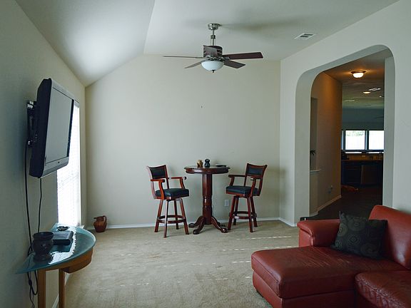 Charming one story three bedroom home in great community. Open floor plan features formal living, dining and study. Large family room with wood burning fireplace opens to spacious kitchen with SS appliances, great storage and breakfast room. Master suite and bath features dual sinks and vanities, garden tub and separate shower. Flex room could be media, exercise or game room. Private backyard with covered patio. Northwest ISD. A MUST SEE!!