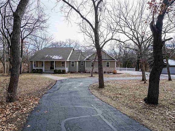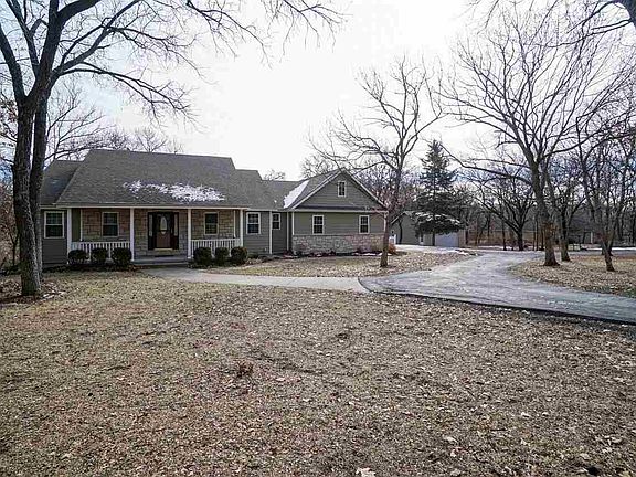 Beautiful custom 5BR, 3.5 BA ranch home w/ country front porch on almost 4 acres with privacy between Manhattan & Wamego. Open plan features limestone accents, hrdwd floors, wired for surround sound, CWP cabinetry, granite counters, screened porch, hot tub, & more! Wood entry is open to spacious vaulted living room w/ oversized windows. Eat-in kitchen is open & has granite counters, SS appliances, CWP cabinetry & large walk-in pantry. Main level laundry w/ half bath. Vaulted master suite has private bath w/ dbl vanities, jetted tub, walk-in shower & walk-in closet w/ built-in shelving. Two other mn level bedrooms convenient to hall full bath. Full walk-out lower level has ultra spacious rec/family room w/ wood stove, study w/ French doors, 2 BRs + 1 N/C, BA work/shop, storm rm w/ access to covered patio. Dbl Attached garage + Dbl detached. All on beautiful 3.7 wooded acres. Wildlife, paved circle drive, Rock Creek schools! Quality construction.