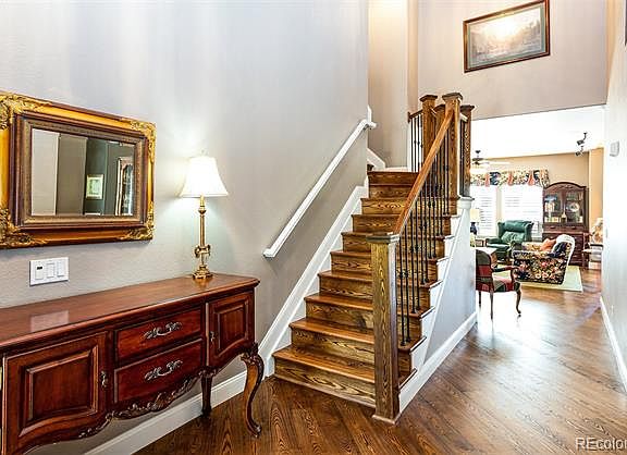 Simply Wonderful home located in The Meadows in Castle Rock!Beautiful Wood Flooring Throughout entire Home! Great open floor plan with lots of light.Majority of Home features Plantation Shutters. Large eat in kitchen boasts 42" cabinets, granite counters and SS appliances. Office on main level. Custom wood floors throughout home with 5"Baseboards. Upstairs has 4 beds including spacious master with large bath and walk in closet. Basement has two large bedrooms, one with built-in bunk beds. The truly unique finished walk out basement with 9ft ceilings is perfect for entertaining or make it your man cave and boast about having the actual basket ball floor from your favorite college team - truly must see to believe! Moveable bar can be placed where you like. Whole house humidifier helps keep your floors healthy! 6 beds / 4 baths - perfect for your growing family! Low maintenance back yard.3 Car Garage with Complete with Fidelity Home Warranty