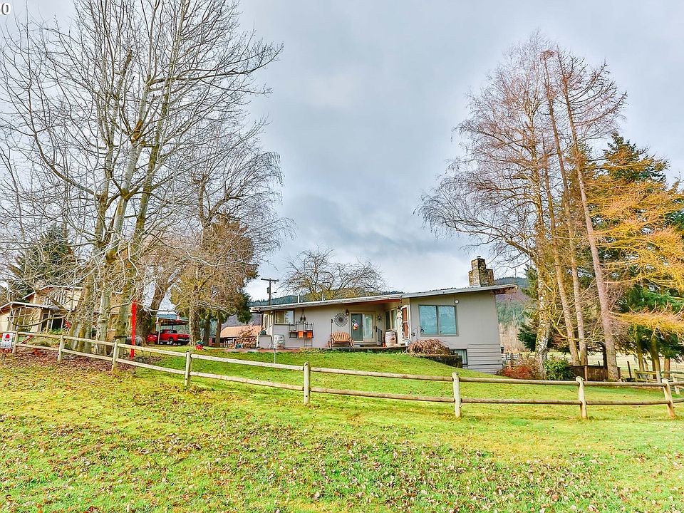 Solid '63 Retro Ranch style home w/ full basement. Single level living on main floor w/ 2 BRs, BA, living w/fireplace insert, kitchen w/granite eating counter, dining area. Beautiful vaulted cedar ceiling in living room as well as cedar ceilings throughout main level. Basement: large family room w/gas stove, spacious Master BR/BA and laundry room. Currently horse property fully fenced and cross fenced and horse barn/garage/storage shed. RV shed is a recent outbuilding.