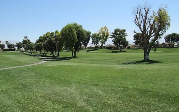 Exciting Golf Course Home featuring a large patio with awesome golf course views. Enjoy Desert living on the Golf Course in this 1800 sq. ft. home. Enter into the living room with dual pane front windows and relaxing view. The kitchen with stainless steel appliances is just off the dining area. Then enter into the large Family room with a fireplace. The spacious Primary Suite feature a dressing area and two large closets. The Secondary Bedroom is just off the Guest Bathroom. The laundry area has lots of storage just off the kitchen. Enjoy entertaining and Golf Course Living where Golf is Free with ownership and the Golf Cart is Included.