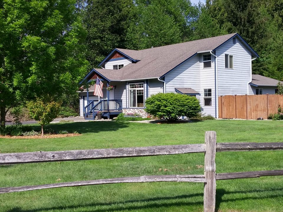 Wonderful flow. 4 BR 2-story on private 1/2 acre with greenbelt along one side. New flooring thru most main living areas. You'll be impressed: from step-down entry LR w vaulted ceilings & cozy frplc to the gourmet kitchen featuring tile flrg, upgraded cabinets & new Solid Surface counters. French doors from kitchen open to spacious family room. From fam rm French doors lead to generous backyd patio for BBQs & fun! Privacy & rail fencing; lg outbldg. Great area; trails; a cozy place to call home.