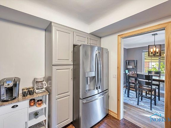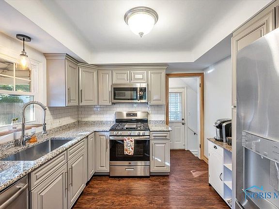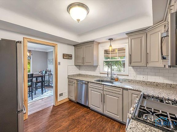 Modern style plus major updates Renovated dream kitchen with gray cupboards, granite counters, subway tile backsplash, farmhouse sink and stainless-steel appliances Finished basement provides extra room to relax. Half bath on main floor plus shower in the basement. Primary bedroom big enough to fit a king bed Vinyl replacement windows, updated lighting, glass block windows in basement, newer furnace and central air. Convenient two car garage. Living room with fireplace. Charming hardwood floors and cove ceilings. Dining room opens to patio and fenced yard. Nest and Ring systems included.