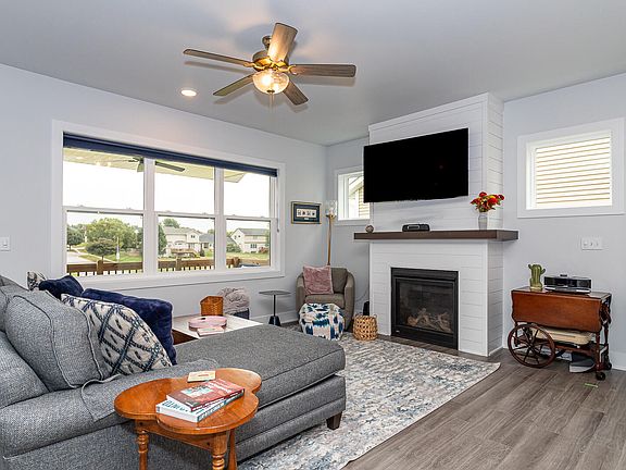 Beautiful 2021 built townhome, located in the Scenic Valley Subdivision in North Ames. Convenient main floor living with abundance of natural light plus a well-designed walk out lower level for additional entertaining space and guests. The main floor features an open concept living area, kitchen with island and a large dining area. There are quartz Cambria countertops and a gas fireplace with a fan to provide additional heat in the winter. The Primary owner's suite has an upgraded bath with Cambria countertops and a tiled bath/shower combination. A large walk-in closet completes the Primary suite. The main floor also features an additional bedroom/home office space with a window seat and large closet with shelves. There is a 3/4 bath along with main floor laundry. A spacious, east facing covered deck with recessed lights and a ceiling fan is off the main living area, ideal for watching colorful sunrises. The walk out lower level includes a family room complete with a wet bar with Cambria countertop and an electric fireplace. The family room in the LL walks out to a covered patio, great for outdoor entertaining space. There are 2 additional bedrooms, a full bath and a very large storage room with a utility sink as well as extra storage under the stairs. Enjoy the beautiful sunrises and sunsets as this town home has east and west exposure. Over 2,770 finished square feet.