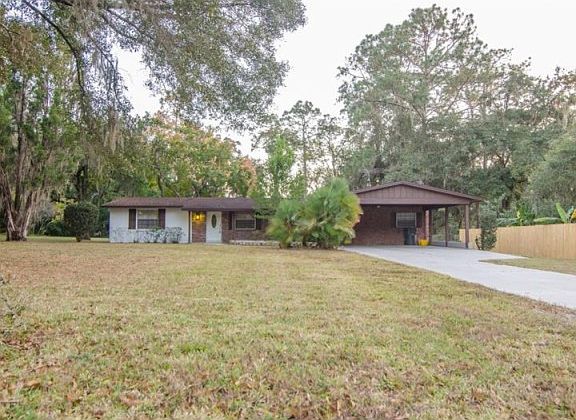 Beautiful 3 bedroom 2 bath Spacious Floor Plan- Home is a split plan with a large living area and french doors leading out to a screened in lanai and overlooking the large private backyard -Large Bonus Room with Wood Burning Fireplace- Over sized carport- Home has a large garage/ storage shed/ work shop all set up with electrical- This home is a Private Must See to Appreciate!