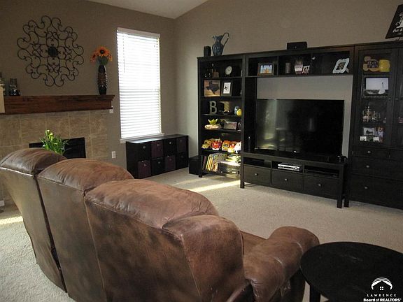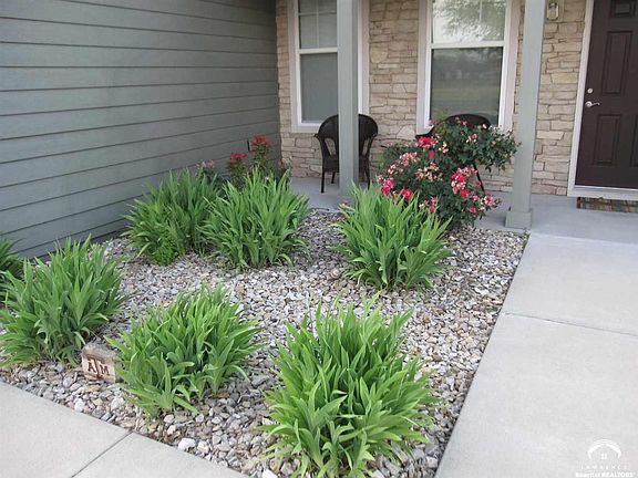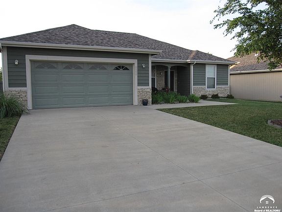 Beautiful home located in NW Lawrence. This home features great room which opens up to adjoining kitchen and dining. Kitchen is complete with granite counters and stainless appliances. Wonderful vinyl floors in dining. Bedroom 2 & 3 are located apart from master for privacy. Master has adjoining suite with double vanity and soaking tub. Backyard is fenced with patio overlooking undeveloped green space. Great landscaping out front complete the beauty!