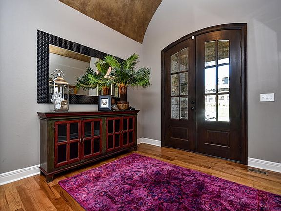 Enjoy this spectacular open concept floor plan with a Mahogany front door, barrel foyer ceiling, raised ceiling great room with a stone fireplace open to the gourmet kitchen with an 8' granite island. Appliances are stainless steel with a 5 burner gas cook top, electric wall oven, microwave, dishwasher and refrigerator plus a washer and dryer. The master suite offers a generous bath with dual sinks and a door-less walk-in tiled shower. The handy laundry room is located next to the walk-in closet. 2 additional bedrooms are on the main floor. The lower level has another living area with a granite wet bar, 2nd fireplace, 2 more bedrooms, a wired media room, storm shelter and lots of storage areas. A two tiered deck with nice view is across the back of the all brick home with a 3 car gar.