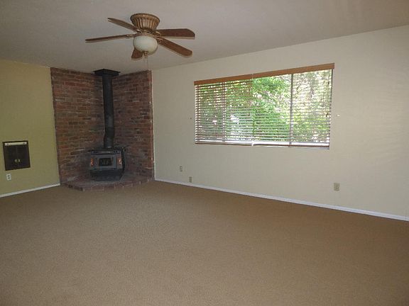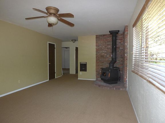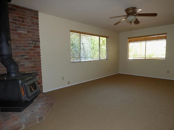 Charming cottage in the woods! Spacious living room with corner wood-burning stove surrounded by used red brick. Large picture windows in all the rooms bring the outdoors inside. Freshly painted interior and new carpet throughout the living room and bedrooms. Large covered front deck that wraps around the north side to the rear covered deck. Sliding glass door in bedroom provides access to deck. Updated ceiling fans and wall heaters in all rooms. Kid and pet friendly chain-link fenced yard with gate. Move-in ready!