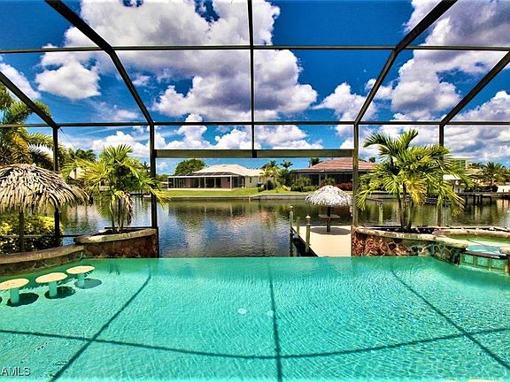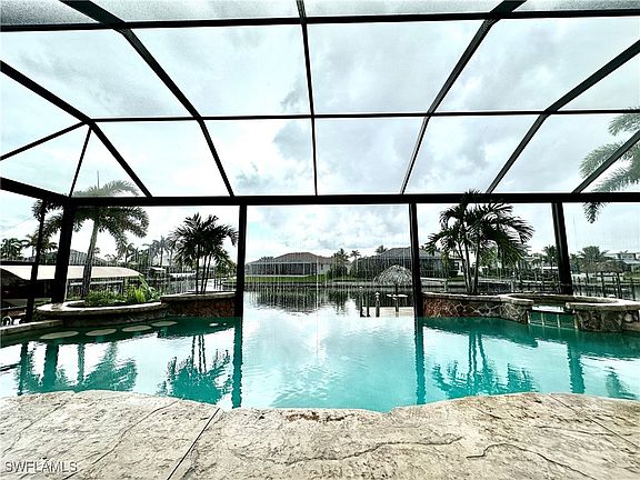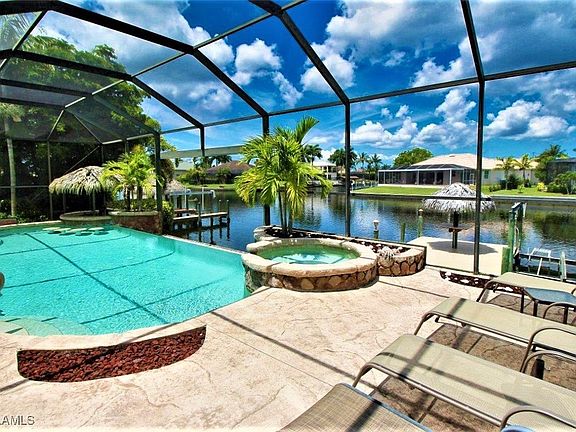Here is vacationing elegance! NOTE: Possibly AVAILABLE April 5, 2025; booked for Season 2026! Turnkey, It is a GULF ACCESS INTERSECTING CANAL home with a composite dock and boat lift. POOL CAGE CONSTRUCTION FORTHCOMING. The pool, its deck, and its awesome view are superfine. The turnkey beauty has a MASTER SUITE with dual sinks, a vast walk-in shower, a huge jetted ROMAN TUB, a linen closet, and a walk-in closet. The split floorplan of its second and third good-sized bedrooms has its second bath, doubling as a pool bath. The Den has additional bedding and a sleeper sofa. Its great room is vast, with a cathedral ceiling, fireplace, TV, and an oversized two-car garage. Dining choices are the pool deck, the formal dining viewing, the deck and lanai, as well as a granite kitchen breakfast bar that is also great for entertaining. This 2368 sq ft home under air is enhanced by a full "90 DEGREE" SLIDER that fully opens to its paver lanai and its INFINITY EDGE, PENTAIR ELECTRIC and/or SOLAR-HEATED POOL and SPA, and vast sunning deck. Enjoy THE OPEN COLORFUL SUNSET VIEWS [while the cage is put BACK on]. Words cannot express its Biltmore and Frances intersecting 150-FOOT-WIDE CANAL VIEW. No showings while tenant occupied.