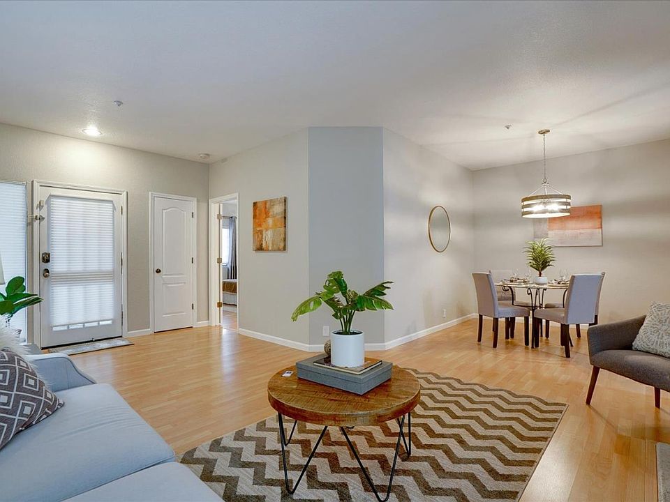 Exceptionally convenient location in resort-like, gated Andalusia and <1 mile walk to BART and Lake Elizabeth! Easy freeway access. Gorgeous 2 bed 2 bath ground floor condo for ease on the legs. High, 9 foot ceilings. Numerous, classy upgrades in the last two years! ~$5K custom window treatments. Expansive kitchen with lushly painted cabinets, vinyl plank floors, wine cooler, and GE slate grey appliances: gas range, refrigerator, microwave, and dishwasher. 2-year-new indoor washer and dryer with steam dry. Other new upgrades: contemporary warm grey walls, Schlage keyless entry, dining room drum chandelier with weathered grey wood-textured accents and vintage LED bulbs, LED flush mount lights, sink faucets, interior door knobs, alarm system, Sky Bell WiFi video doorbell, and Chamberlain WiFi garage door opener. Open and inviting floorplan with gas fireplace and slider leading to patio for indoor-outdoor entertaining. Community pool, spa, and clubhouse. Classy, contemporary, convenient!