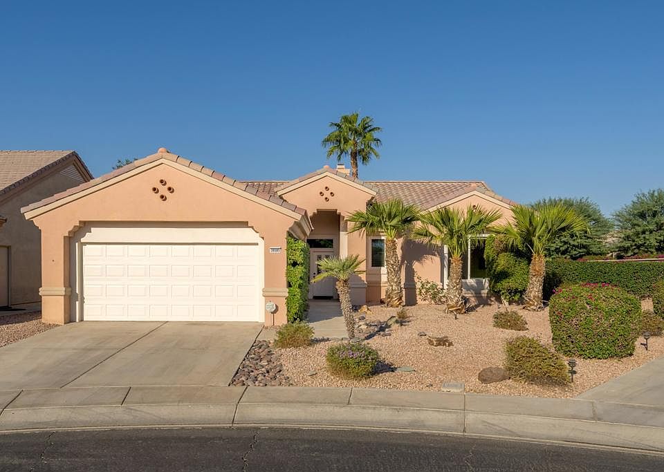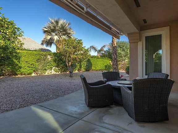 Sun City Palm Desert - Morocco. Located on a quiet cul-de-sac, this expanded version of one of Sun City's most popular floorplans has 2 ensuite bedrooms, a powder room and a den. The spacious rear yard has an extended patio with an electric awning surrounded by low maintenance desert landscaping. Furniture available outside of escrow. Inside, 10ft ceilings and transom window provide a light and open environment. The great room has a tile trimmed gas fireplace. The kitchen has extensive cabinetry, a chef's island and corian counters. Upgraded cabinetry in the kitchen and bathrooms. Off the greatroom is a spacious den/office. Double doors open to the primary suite that has a large walk-in closet with built-in storage and shutters. The primary suite bathroom has dual sinks and a custom tile stall shower with rimless glass enclosure. The guest suite bathroom has a tub/shower. The 2-car garage has an epoxy floor, built-in storage and a nook for golf cart parking.