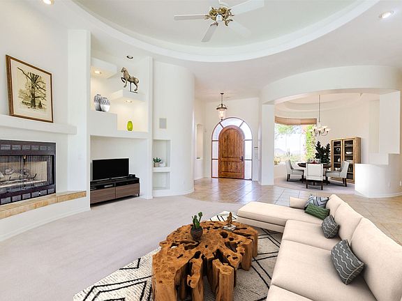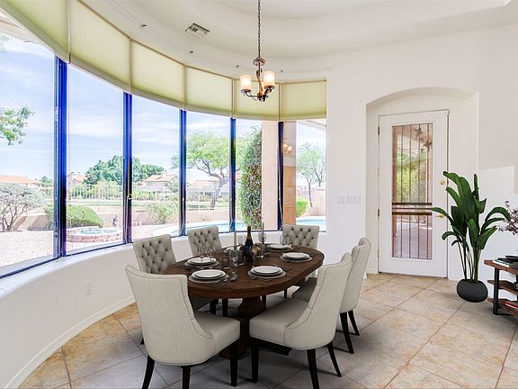Reduced 35k! Situated on a private lot on the 7th hole of the Pete Dye golf course at Red Mountain Ranch. This single story custom home features a great room concept and split floorplan. Upon entering you will notice the attention to detail with coffered ceilings, curved architectural windows with a very open floor plan concept. The great room overlooks the backyard and features gas fireplace, large sitting area and oversized windows with views of the pool and golf course. The dining room has architectural curved windows, coffered ceilings and is nicely sized for entertaining needs with views of the front courtyard area and fabulous sunset views.The kitchen has an large eat in area, kitchen island, dual ovens, pantry, and gas cooktop.and exterior access to the backyard area. The larg