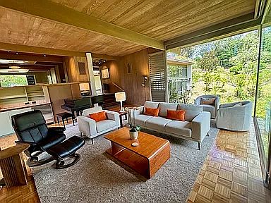 Mid-century hawaiian modern homeHigh ceilingsFloor-to-ceiling windowsLarge windowsNatural lightSliding doorsCool trade winds