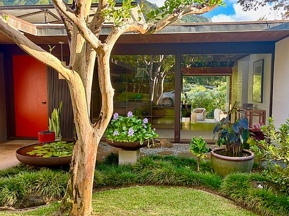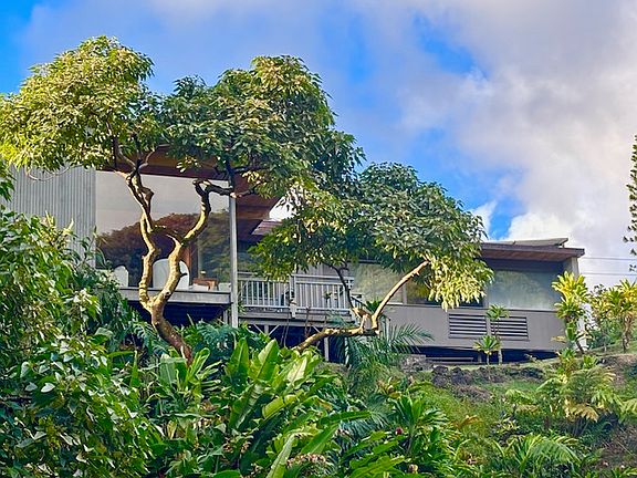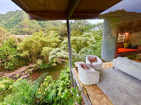 Perched directly above a waterfall and pond in the cool rainforest of Upper Nu'uanu Valley, this updated 3 bedroom, 2.5 bathroom, Mid-Century Hawaiian Modern home offers a rare opportunity to live in a beautifully designed home in a gorgeous tropical setting. The home features spectacular waterfall, pond, and mountain views and has seamless indoor-outdoor living.