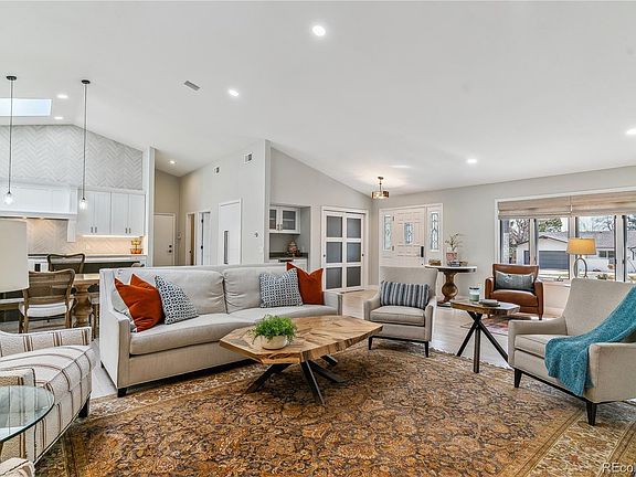 The gourmet kitchen is a chef’s dream with GE Monogram appliances, custom cabinetry, quartz countertops, a farm sink, and a tile backsplash. It seamlessly opens to the living room, which boasts a custom mantle surrounding a gas fireplace, custom floating shelves, a wine fridge, and built-in cabinets. The covered patio is an entertainer’s paradise, featuring a built-in grill, granite countertop, beverage refrigerator, fireplace, and TV—perfect for enjoying the outdoors in any season. The luxurious primary suite offers a 5-piece bath with a large shower, standing tub, double vanity, quartz countertops, tile flooring, and heated floors. The second bedroom is connected to a beautifully renovated bathroom with high-end finishes and heated floors. Conveniently, the home has a dedicated laundry room with custom cabinets, tile flooring, a utility sink, and a stackable washer and dryer. Downstairs, the finished basement features two additional bedrooms, an entertainment area, and a home office space. The basement bathroom is updated with modern finishes. The property is complete with ample storage space, including a large shed, plenty of closet space, and a 3-car garage. The fenced backyard is dog-friendly and includes an electric fence in the front yard, offering peace of mind for pet owners. This home is ideally located near Pinehurst Country Club, Colorado Academy, and Mullen High School, with easy access to downtown, shopping, libraries, restaurants, and a short drive to the mountains and ski resorts. The perfect mix of tranquility, convenience, and luxury!
