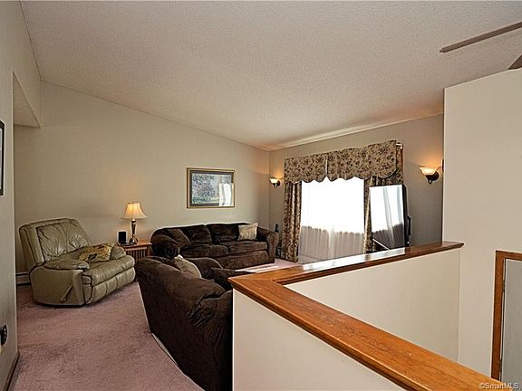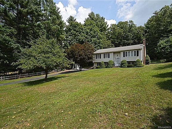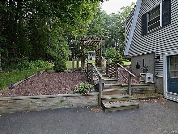 Call or text the List Agent Joyce Covone 860-608-1708. Unique cathedral ceiling in the foyer that opens to the living room creates a spacious floor plan. Oak kitchen with plenty of cabinets and tile flooring. Dining room with slider to the deck. Main bath with linen closet. Generous master bedroom and 2 additional bedrooms completes the 1st level. Finished lower level with new carpeting and a flu for a wood stove hook up. Also, plenty of storage, laundry area, and a full bath with shower. Walk out basement to the paved driveway and steps through the beautiful arbor to the private back yard. 16x10 Gambrel shed for extra storage.