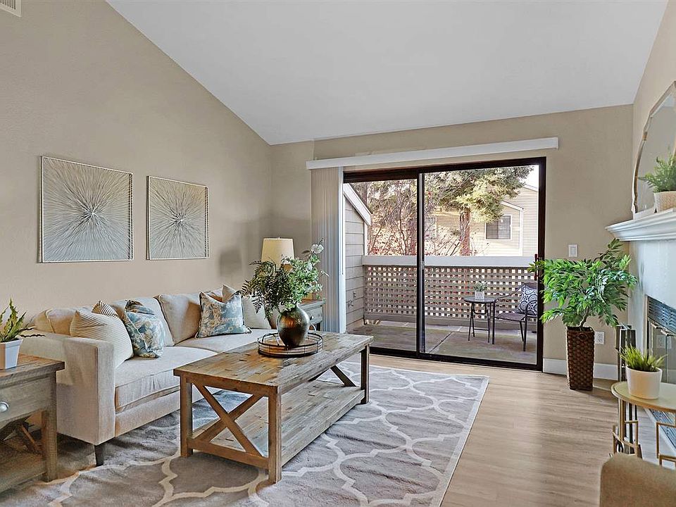 What a GEM! Beautiful top floor unit in desirable gated Canyon Lakes neighborhood * Upper level unit features soaring ceilings, gorgeous laminate flooring throughout & a spacious great room with gas fireplace * An updated kitchen offers white cabinets, granite countertops and stainless steel appliances * Abundant natural light streams in from the large sliding door, which provides access to a private deck off of the living room * Updated master bathroom features granite countertops, white cabinets, and travertine tile stall shower * Laundry in-unit with washer and dryer * Spacious spare bedroom and full bathroom ensuite * Short distance to Club Sport Gym and downtown San Ramon City Center * 1-carport & abundant guest parking * Community features beautiful pool, spa, fitness room and clubhouse * Award winning San Ramon Valley Unified School district *