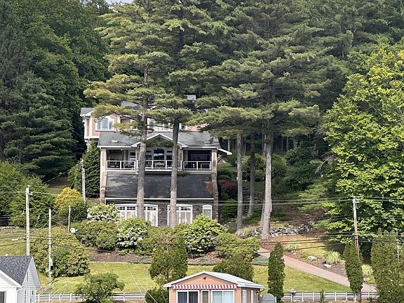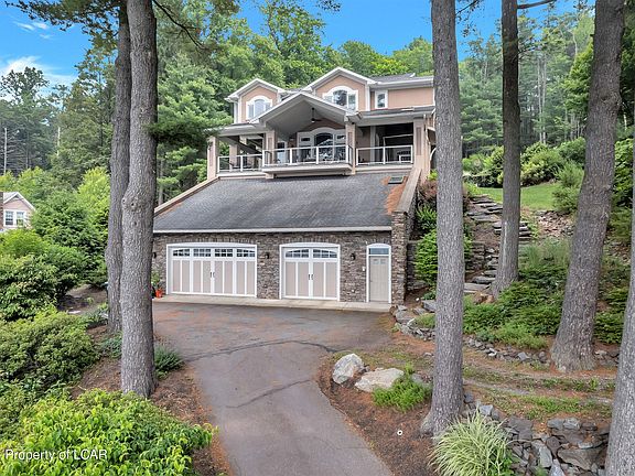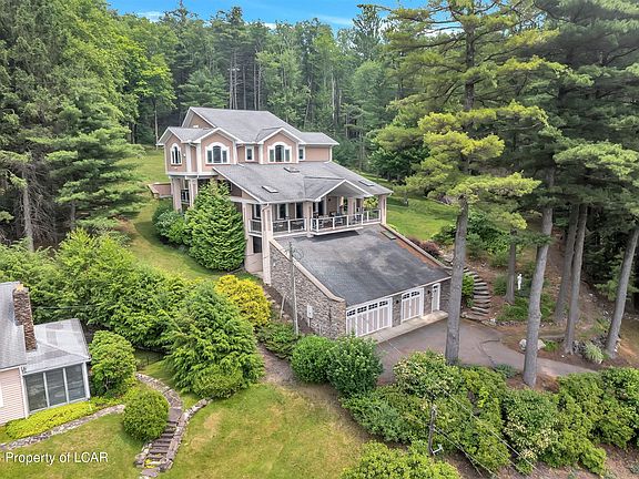 Castle on the hill at Harveys Lake with 95' of Direct Lakefront, dock and cabana w/ 1/2 bath! The home is situated on 1.55 acres of very private land overlooking the lakefront. Enjoy your own dock/boathouse with living, bathroom and deck. House features spectacular views, Cherry Wood Floors & Radiant Heated Flrs Throughout, Gas FP, Lg Eat In Kitchen, Mst Bed with Den and Walk in Closets,