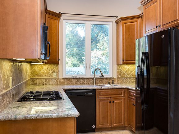 Stone backsplashTall ceilingsLaundry room off kitchenBlack appliancesGas cookingGranite counter-topsArtificial turf