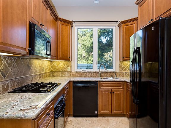 Open Concept Kitchen with wood cabinets, granite counter-tops and black appliances, stone backsplash, gas cooking, built-in microwave