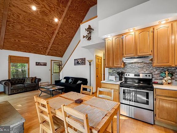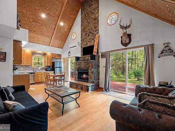Adorable log cabin situated on over 5 acres for peace, quiet, and relaxation! Perfect for full time living or for a place to escape the hustle and bustle. The HOA states the property may not be used for an AirBnB. The front porch extends across the front and wraps around to the back of the home. You are greeted with an eye catching stone gas fireplace that extends to the high, vaulted ceiling. The kitchen and living room have hardwood floors and sliders that open to the deck. The open concept is perfect for entertaining and on the cool nights being able to open the sliding glass doors allows even more living space! There are 2 bedrooms, full bathroom with tub/shower, and stackable washer/dryer on the main level. Upstairs is the primary suite with sliding door that leads to a private balcony to enjoy that perfect cup of coffee, and a half bathroom. There is an extensive whole house water filtration system located in the crawlspace. The septic was pumped in 2023. The HOA is $100/yr. Internet is provided by Hardy Net. Explore the 5.26 acres the property offers, and still head over to Lost River State Park that is only 4 miles away for more fun and adventure! The property is currently an AirBnB due to being grandfathered into the HOA for the current owner, however, the new HOA bylaws state that short term rentals will NOT BE allowed for the new owner. This home was only on the market for awhile because the showings were limited due to all the guests that occupied! There was nothing wrong with the property!