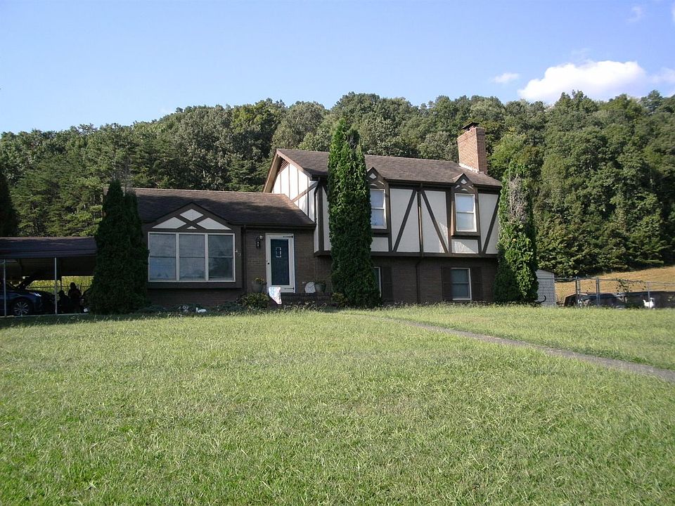 Brick and stucco home with breath taking views. Main level has foyer, living room with lots of natural light, kitchen with plenty of cabinets, dining with doors out to patio. Second floor has 3 bedrooms, master bedroom has cozy deck, and full bathroom with double sinks. Basement has family room with wood burning fireplace, bedroom and bathroom. Fenced back and side yard with concrete patio and above ground swimming pool. Three storage buildings, 2 car carport, lots of off street parking, all sitting on approx. 4 acres with 4 wheeler trails in woods behind house. Seller says additional house seats where a trailer sat at one time.