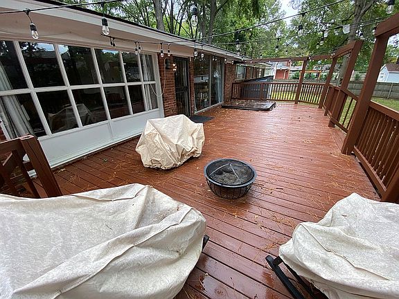 Lighting has been updated throughout the interior and exterior. A 5-Ton SEER gas/electric HVAC unit (2021) and duct work with transferable warranty installed through Patton Plumbing, as well as a new roof installed in 2020. Kitchen has been updated with paint and beautiful solid butcher block island. New appliances have been installed with a large walk in pantry/laundry room. Custom blinds installed in all bedroom and kitchen windows. Deck includes a built-in hot tub with recent repairs including new filter, pump and cover. New light switches and outlets, as well as an additional breaker box that has been added to exterior of house where generator can be attached. Fireplace has been updated and custom built-in shelves added on each side, as well as a new gas line run to it underneath the home. Lots of tree work has been done to protect the home. Bathrooms include beautiful vanities, new toilets and great lighting. Security system is installed but not included unless buyer wants to purchase.