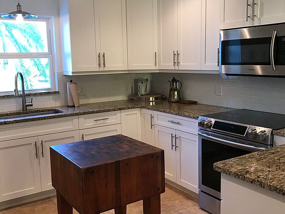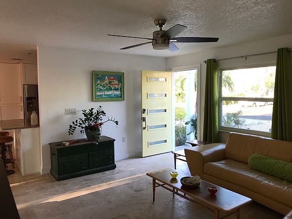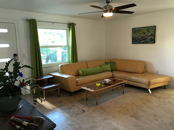 This beautiful beach home is completely updated and move in ready. Major renovations and new addition completed November 2017. Renovations include all new electrical wiring, new plumbing lines all they way to the street connection, complete renovation of the original bathroom, and conversion of original kitchen to a sitting area with wet bar, new cabinets and wine cooler. The professional renovation seamlessly ties into the new construction with level travertine flooring throughout. All new double pane energy efficient windows, newer AC, new insulation in attic, new instant hot water heater, and new standing seam metal roof. New construction includes a huge kitchen, dining room, huge master bedroom suite, inside laundry room with half bath, and a single car garage. The master bedroom has a master bath, huge walk-in closet plus two standard sized closets which is rare for homes in this area. The kitchen has custom wood cabinets and soft closing drawers, granite counter tops and stainless appliances. The back yard has mature vegetation with a large oak tree and gazebo for shade, travertine pavers, and a wimsical fire place. The traditional Florida beach front yard is sunny with a cactus garden and refurbished gravel which provides plenty of room for offstreet parking for additional vehicles, boat or RV. The driveway has new brick pavers and the garage is extra long with an 8' high door so you can park an SUV in the garage!