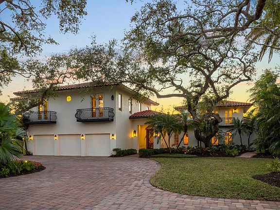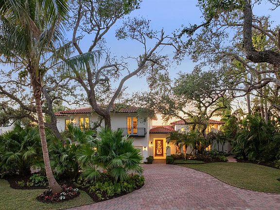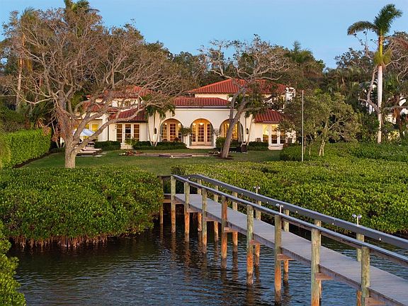 A testament to timeless elegance and the tropical charm of coastal living, securely situated at or above base flood elevation. This exceptional Bayfront estate rests on nearly one acre, boasting 180 feet of water frontage and effective year built 2016. Fully renovated and expanded in 2017, it offers breathtaking, uninterrupted views of Roberts Bay and the intracoastal Waterway, where mesmerizing sunsets serve as a daily invitation to pause and savor the moment. Nestled privately off Red Rock Way, the property ensures tranquility and seclusion. A grand entrance leads you past the library into the casually sophisticated living room, featuring French doors, a custom coral gas fireplace, and French oak flooring. Adjacent to the living spaces, the dining room and expansive covered terrace create the perfect ambiance for entertaining, with coral flooring and a pecky cypress ceiling adding character and charm. The gourmet kitchen is a chef’s dream, showcasing custom cabinetry in painted wood and natural walnut, luxurious Calacatta gold marble and quartz countertops, Thermador appliances, a spacious island, and a convenient wet bar. The inviting family room, complete with a wood-burning fireplace and French doors, opens to yet another terrace, seamlessly blending indoor and outdoor living. The master suite is a serene retreat, featuring a vaulted paneled ceiling, a large private terrace, his-and-her bathrooms, an outdoor shower, and oversized walk-in closets. The second floor hosts three en-suite bedrooms, while a fifth guest suite offers complete privacy, making it ideal for visitors. The backyard is a true oasis, highlighted by a heated pool with a spa, surrounded by fresh landscaping, mature palms, and century-old oak trees. The waterfront dock caters to boating enthusiasts, water sports lovers, anglers, and those who enjoy soaking in the sunset views. Located west of the Trail, this remarkable estate is just minutes from world-class beaches, vibrant cultural venues, exquisite dining, and an array of recreational activities.