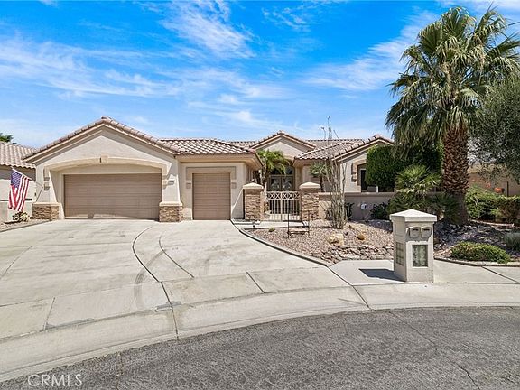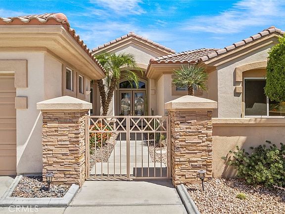 Welcome to this stunning home in the prestigious Sun City community of Palm Desert. Renovated in 2020 and highly upgraded Monaco floor plan with 3 bedrooms and 3 bathrooms, which has golf course frontage to the 5th fairway. Custom double glass front doors open to 12-feet high ceilings, then all glass great room wall with views to the spa and mountains beyond. Beautiful pebble tec with stone veneer waterfall spa that is large enough to accommodate 10 people. Flooring is 20 inch tile in every room with 6 inch high baseboards. Recent kitchen upgrades include granite counter tops, glass-tile backsplash, and double sink. 2 Restrooms have quartz countertops, the third has a pedestal sink, and all water closets have been replaced with energy efficient units. Multiple glass in the windows have been replaced. 2-car plus golf cart garages with storage cabinets, and work bench with 12 drawers. The home has a secure entry courtyard, and the rear yard is beautifully landscaped with palm trees, covered patio, and a wide variety of cactus plants all on drip system(s). The cul-de-sac street location enhances privacy, and the front elevation is further enhanced by a beautiful stone veneer base, which is rarely seen in this community. The home has an evaporative cooler in the garage to help reduce electricity costs. Furniture is available, and to be negotiated outside of escrow. A must see before the fall and its gone!