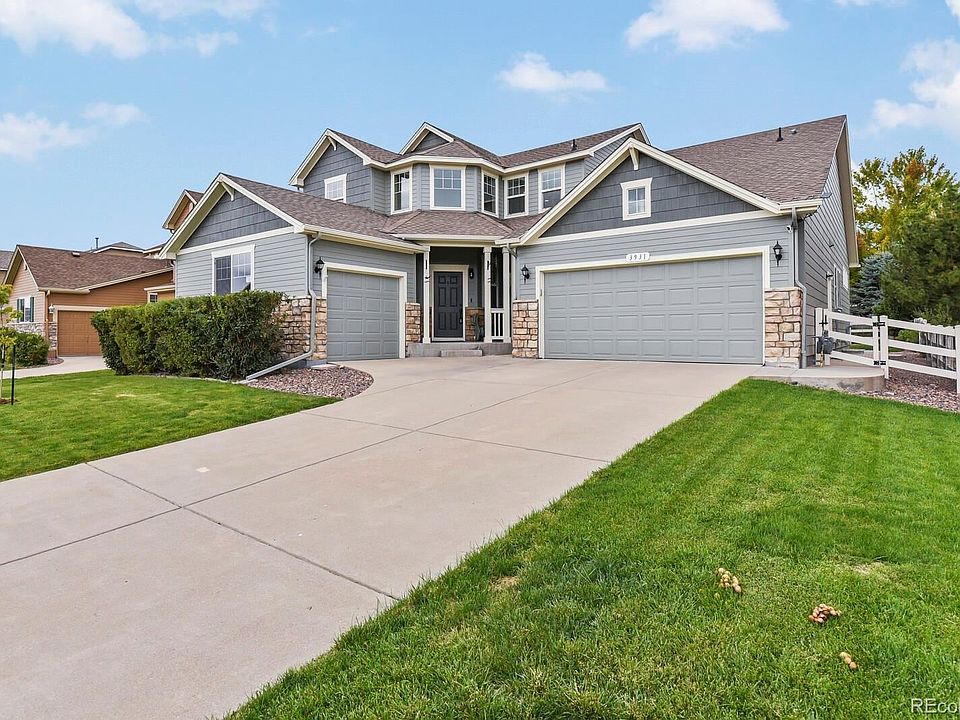Fabulous 5 bedroom/5 bathroom home in Crystal Valley Ranch. Built in 2007, this floor plan has it all and then some. Main floor office with double doors and decorative shelving off the entry. Formal dining room with easy access to the gourmet kitchen. Double ovens, gas cooktop, convection microwave oven, and island make cooking in this kitchen a dream. Corian counter tops with breakfast bar area and eat-in kitchen space that opens up to the family room area makes for easy entertaining! Main floor primary bedroom has private 5-piece bathroom and walk-in closet. Custom barn doors on the bathroom add charm and privacy. Main level has extensive hardwood floors, all plantation shutters, and new lighting. Sellers have updated the windows and slider on the west side of the home. Upstairs there is a loft area, 2 spare bedrooms, and a full bathroom for the bedrooms to share. The finished basement has an oversized great room & game room area that can be used for watching TV, workout area, pool or ping pong table. There is a wet bar with beverage refrigerator that is central to the space. Basement has 2 additional bedrooms and 1 full bathroom and 1 half bathroom for guests to use. The basement has a utility room that has lots of room for storage. The 2-car attached garage has a finished floor and exterior door for access to the backyard. The separate 1-car garage also has a finished floor, and is great for that 3rd vehicle, motorcycle, or yard maintenance equipment. Nice sized front and back yards are beautifully landscaped and have automatic smart sprinkler sprinkler system. Entertain and have BBQ's on the oversized concrete patio in the backyard. Natural gas line to the grill (included) or use the gas line for a fire pit on cool Colorado evenings. House is close to neighborhood park, trails, and Rhyolite Regional Park. With over 4600 sq. feet, this house has room to spread out, ability to work from home, and have hobby spaces. Don't miss out on this incredible opportunity!