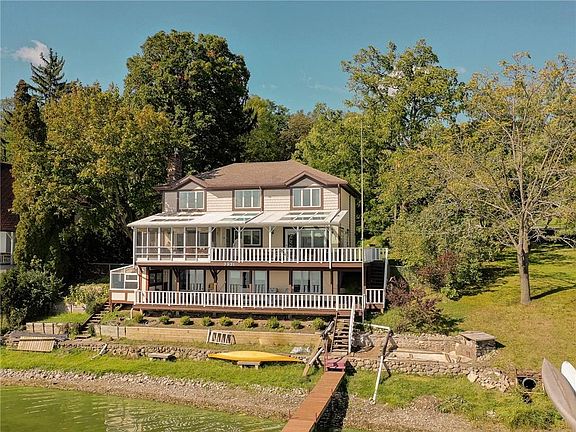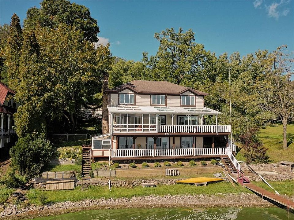 Classic, spacious lakefront living on 94' of frontage with a deep lot all in an upper west side location convenient to interstate access. This well appointed home has three levels of waterfront living in an area of similar homes. The entry level gives you a large living room with a custom fireplace and bookshelves. The living room opens to a beautiful 3 season room overlooking the water. The main floor also includes the formal dining room, eat in kitchen, laundry and half bath. The upper floor has the master bedroom with an en suite master bath, two guest bedrooms and a full bath. The lower floor enjoys two bedrooms, full bath, fireplace with a living room area and an open walkout to the lower level full porch overlooking the waterfront and a potting shed . Much more. Act soon.
