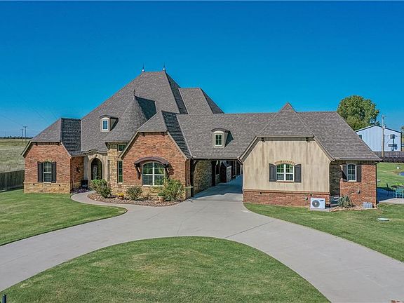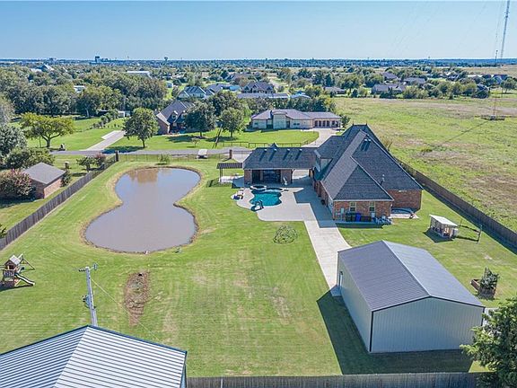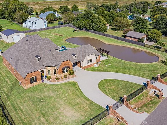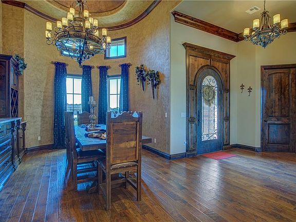 Custom, custom, custom! Elegant entry way & formal dining area is fit for a king with rotunda ceiling and enough room for a 10-12 person table. The gourmet kitchen is the center focal point of the home boasting a massive island/breakfast bar, over sized pantry, 5 burner built-in gas stove top & double ovens. All bedrooms are downstairs, have walk-in closets & engineered wood floors. Private master bedroom featuring incredible en suite with claw foot tub, double vanities, walk through shower & large walk in closet that flows into the laundry room. Functional laundry room has mud bench, space for extra freezer & pet bath. Upstairs theater/game room is complete with bar, media equipment & full bath. Outside you will enjoy your own private oasis with gated circle driveway, gunite pool & hot tub, spectacular cabana with overhead doors & half bath, well fed pond, 30x40 shop & 1.4 acres. All this plus, safe room, geothermal for minimal utility bills & convenient central vacuum system.