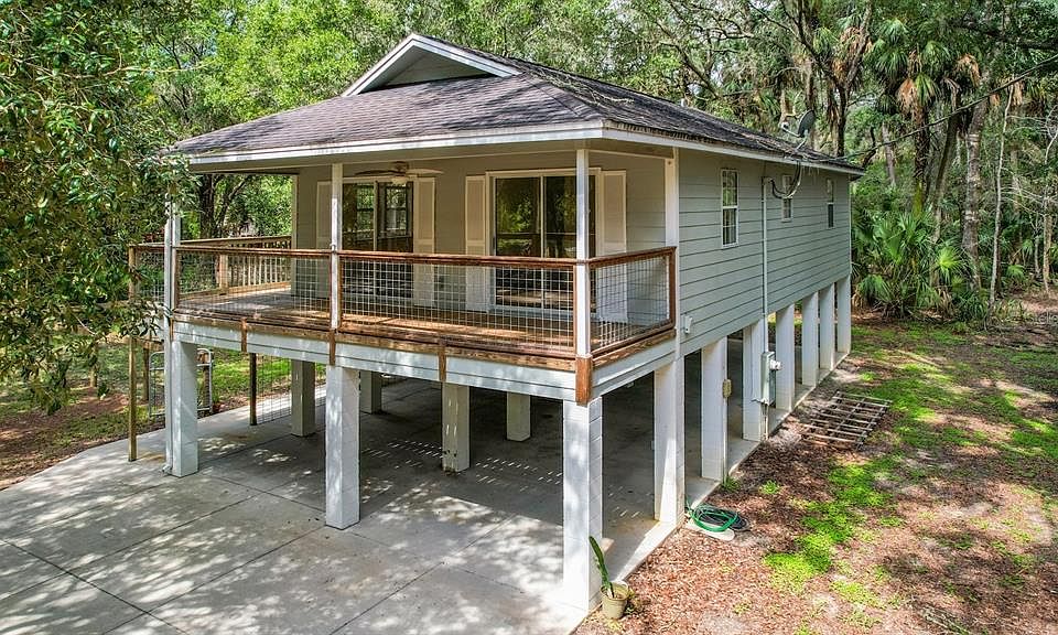 Under contract-accepting backup offers. This beautiful two-bedroom stilt home, built in 2006, that sits on 2.67 private acres in the Inglis/Yankeetown area is your hidden Oasis. Perfect for boats, campers (comes w/ R/V hookup), and all your toys, with room to spread out and enjoy nature, fishing, boating, and hunting. Close to marinas and public boat ramps for easy Gulf access, or stroll to your own pond in your front yard and cast a line. Inside you have all stainless steel appliances, an electric fireplace, energy efficient windows (dual*pane w/ vinyl trim), just to name a few. A wraparound wood deck extends along the front and side of the home, welcoming outdoor space and elevated views. The downstairs offers a finished concrete area with ample space-ideal for parking vehicles, storing boats, or future expansions if that is what you are looking for. Also added on the side is a fenced in area for your favorite pets to stay close by. Enjoy the creek that runs along the back of the property, open space for gatherings around the firepit, this property has everything you need for an outdoor enthusiast.