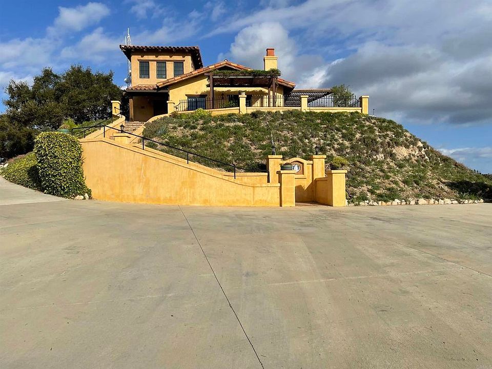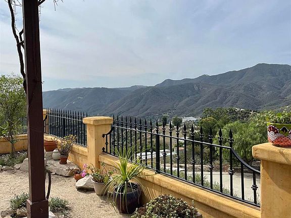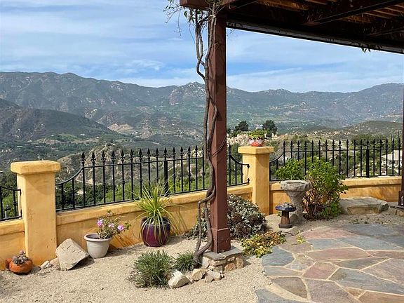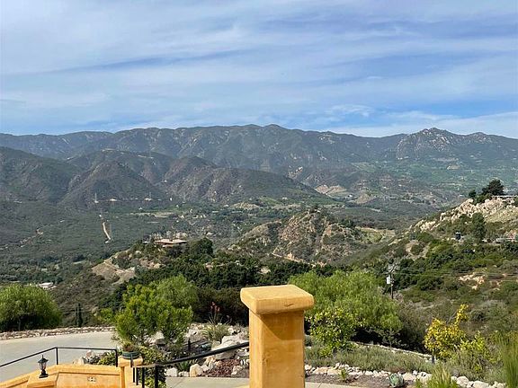 Stunning views from this eagle's perch with a Tuscan feel designed into an environmentally friendly constructed home. The home is built with insulated compound concrete forms, "Rastra" manufactured, that create 15" thick concrete highly insulated walls. Radiant heated floors make for cozy comfort as you enjoy the beautiful views from your living room while seated in front of the fireplace. A Tesla battery whole house electrical backup system coupled with solar panels maximize this home's efficiency and reliability.There is an approximately 120 avocado tree producing grove on the property. There are two additional pads on the property to construct a studio or additional living space.The backyard is fenced with wrought iron fencing. Enjoy the views and relax.