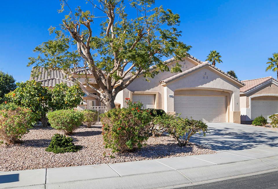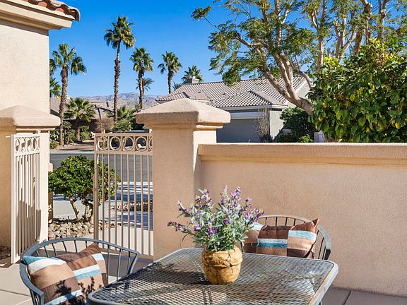 Sun City Palm Desert! The most popular great room model - The St Croix! This home has the den extended into a full bedroom with a closet. Or it can be a spacious den with sitting area for TV viewing. Neutral tile throughout, except for carpeted bedrooms, Great room leads to spacious expended covered patio, Very private area with 4 different fruit trees. Kitchen has lovely GE appliances, Stainless steel oven with convection bake, updated GE Stainless french door refrigerator with extra drawer and ice on the door, GE range, along with stainless wine refrigerator and Galanz two door air fryer. Light maple cabinetry with light gray toned corian. Master bedroom has a door leading to the patio, counter with two sinks, stall shower, and huge closet! Secondary bedroom has a nearby bath in the hallway, which has a tub/shower unit. The third bedroom (or den) is off the great room with doors for entry and a closet. There is a lovely courtyard with gate when entering the property to keep any small petssafe. Also includes a 2 car garage plus golf cart garage with several stoage cabinets available. This is a probate sale, however judge has already awarded full power to the beneficiary, so escrow can be closed very quickly, Make this pristine home your own within one of the top retirement communities in the USA according to Money Magazine! You will have a safe, securely gated community with 2 golf courses, pro shops, driving range, pitching and chipping practice are