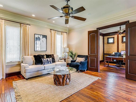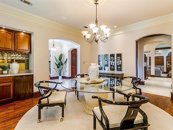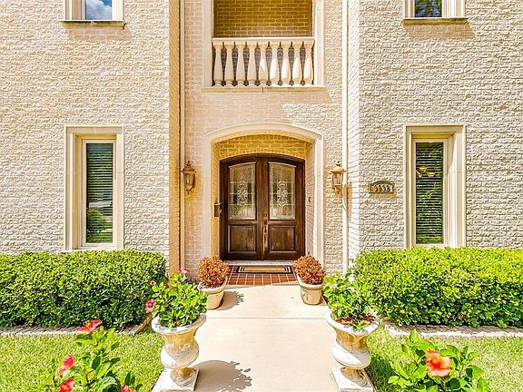 Magnificent Tuscan castle situated on one and a half lots with an open floor plan adaptable to the most discerning lifestyle. This home is a true masterpiece of architectural design and engineering featuring a formal living room with cordial bar and fireplace, executive study with private entrance, formal dining room with wine bar, gourmet kitchen with butler's pantry, huge family room with wet bar, a large game room with kitchenette, a terraced theatre with surround sound, and a fully insulated Texas size four car garage. The first level primary suite with 17' coffered ceilings unsurpassed in luxury and elegance has dual baths with frameless shower, jacuzzi tub, and dual closets with many built-ins.