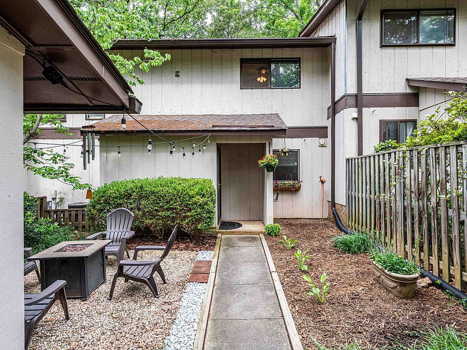A unique find close to NC State mimics more of a townhome than a condo! You'll appreciate the covered parking with storage! Courtyard-like entry is ideal for your green thumb but you even have a fenced-in backyard too! Hello summer time cookouts & take a dip at the community pool! The kitchen is ample in size with freshly painted white cabinets & throwback black & white checked flooring! Dining room offers flex space! The family room has enough space for one of those cozy sectional couches and french doors lead to your private yard. Upstairs you have a primary bedroom with an updated ensuite bathroom and walk-in closet, while the other offers lots of space and a double closet with bathroom access across the hall. (Ideal roommate setup). The location is one of my favorites with easy access to both Cary & Raleigh - it is like this little unknown sweet spot. Quick Uber ride to enjoy all of downtown's offerings and close-by access to Park & Ride lots that Wolfline serves to get to classes at NC State. Plus within a mile of Carter Finley Stadium, PNC Arena, 40/440, etc. Caniacs & NC State fans unite.
