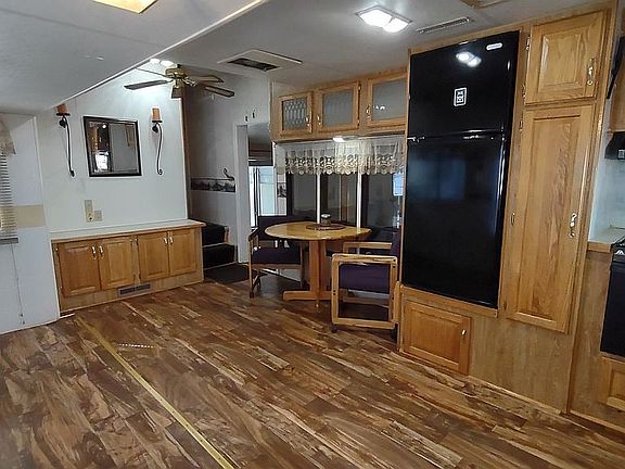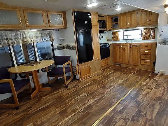 1994 KING 8x38 5th Wheel with slideout • 11’ x 18’ kitchen / dining / open space with tons of cabinet storage, with stove, built-in microwave, refrigerator • 7’7” x 9’ bedroom w Queen platform bed with underneath storage, with closets and cabinets • Bath: 4’8” x 5’ with 24” x 46” walk-in shower, porcelain non-RV toilet • New gas furnace 9/2022, 20gal electric hot water heater w new element 9/2022, Roof recoated 9/2022 12’ x 20’ Living room insulated wood framed addition on concrete pad with 'view' wood stove, 2 ceiling fans, electric baseboard heat and pet door 9’x24’ private covered paved patio 9’5”x7’ Laundry room with washer & dryer, full size 2nd refrigerator and full size freezer 12’x12’6” upstairs shaded deck 9’4 x 11’ room with windows is below the deck (detached and a stand alone building) 11’8” x 20’ covered paved carport 8’ x 12’ separate detached framed storage shed 8’ x 8’ "under 5th wheel" storage shed Space101 is a large shady quiet end lot on dead end street Current Space Rent $494.70, includes water, sewer, trash, basic TV cable