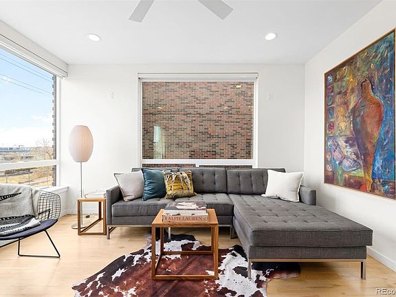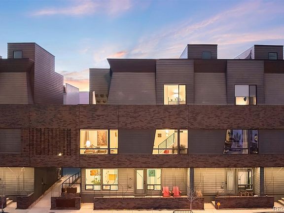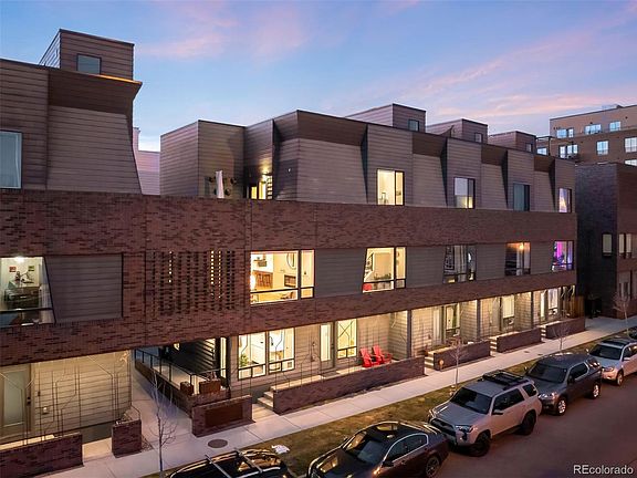 CORNER UNIT * NO HOA – PARTY WALL ONLY W/MAINTENANCE FEE $63/month * PRIVATE ELEVATOR * LOCK-OFF WORK SPACE AND/OR BEDROOM * MOTORIZED HUNTER DOUGLAS AUTOMATED SHADES ON LEVEL 1 & 2. Discover modern urban living in the heart of Sunnyside with this impeccably designed townhome in the 29-home Railhouse development by award-winning architects Meridian 105. Located just steps from the 41st & Fox Light Rail Station, this residence offers intelligent design, featuring expansive windows that flood the interiors with natural light and provide stunning panoramic views of Denver’s skyline. It seamlessly blends style, functionality, and sustainability.
