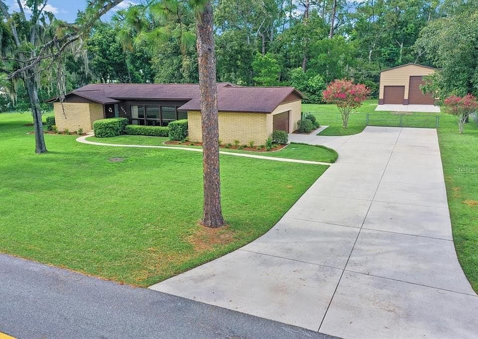 CUSTOM MID-CENTURY GEM IN SE OCALA! This stunning 3 bedroom, 2 bath home sits on a spacious .77-acre lot in one of SE Ocala’s most sought-after neighborhoods and school district. Built to last with split-faced limestone block and showcasing floor-to-ceiling windows in the living room, this residence blends timeless mid-century design with today’s modern conveniences. Enjoy Florida living with your open-air pool and expansive outdoor space, plus a newly built detached garage (2020)—in addition to the attached garage—both equipped with 220-volt plugs for RV hookup or EV charging. Recent upgrades ensure peace of mind: NEW RENEWAL BY ANDERSEN WINDOWS AND DOOR (2023), NEW WATER HEATER (2022), NEW AC (2015), NEW ROOF (2012). Inside, you’ll find an indoor laundry room, a smart thermostat, and a smart irrigation system you can control from your phone. A rare opportunity to own a thoughtfully updated mid-century home with modern efficiency, ample storage, and unmatched character in SE Ocala.