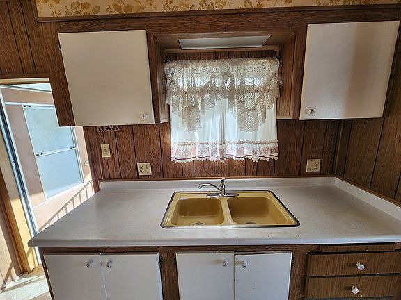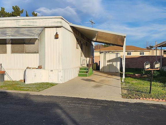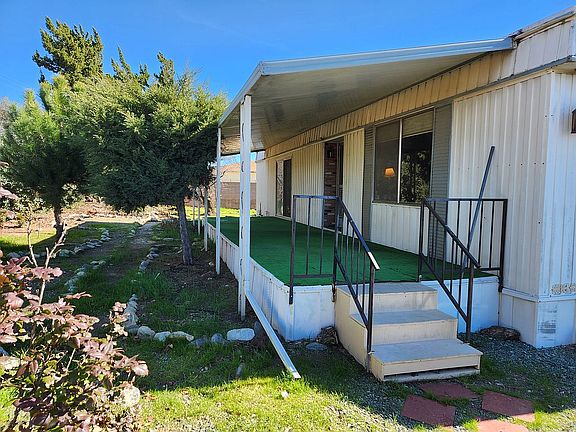 Double wide mobile home with covered porch and covered carport fits 2 vehicles. Large corner lot has fruit trees and view of mountains. Quiet 55+ community.