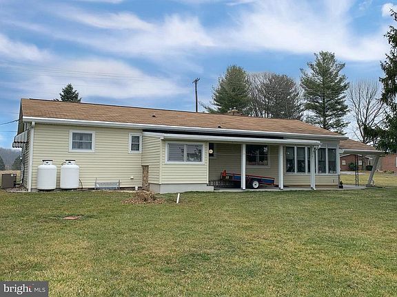Inviting and attractive single story home with a stone and siding exterior, carport, enclosed breezeway, and on a .7 acre lot along a country road. Level lot with nice backyard and scenic views of the Appalachians. Spacious living room, eat-in kitchen, dining room. 3rd bedroom well suited as an office. Full, semi-finished basement with rec room and workshop. Two fireplaces, currently fitted with propane inserts, one in the living room, one in the basement rec room.