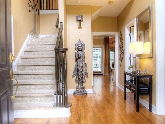 - Interior: 2-Story Foyer, Entrance Foyer, Trey Ceilings, Wall/Wall Carpet, 9 ft + Ceil Main, Bookcases, 10 ft + Ceil Lower, Rear Stairs