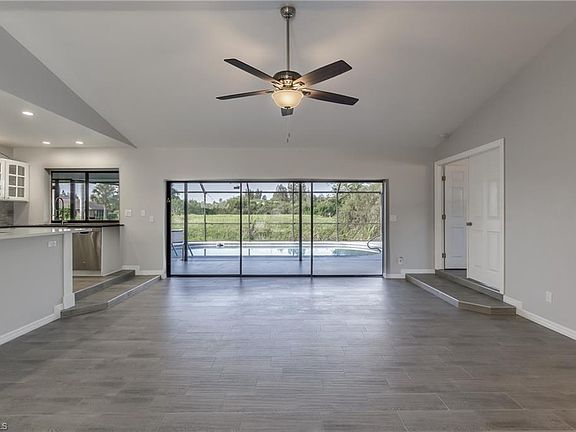 Updated POOL home in fantastic SE Country Club neighborhood! Almost 2000sq ft, 3bed/2bath, gorgeous NEW plank tile flooring throughout entire house, newly renovated guest bath with double vanity and pool access, fresh interior paint, high efficiency TANKLESS WATER HEATER, stainless steel appliances and QUARTZ kitchen island. Vaulted ceilings, open floor plan, and a large dedicated laundry room make this a great family home. 2-car garage. Pool has extended patio for outdoor living, serene view overlooks the former Cape Coral Golf Club, SW rear exposure. NO FLOOD INSURANCE REQUIRED. ASSESSMENTS IN/PAID. This one is priced right and will not last long, schedule your showing NOW!