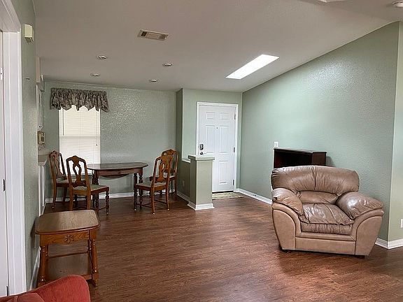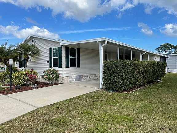 This spacious 1624 sq. ft. move in ready, open floor plan offers both ample entertaining space and desired privacy with newly replaced roof. The brand new, large covered carport, leads to a shed, providing additional storage. With two entrances, two bedrooms, two baths, a large open living room and a den with built-in cabinets, this well-maintained split home offers comfort and functionality. The Florida room serves as a delightful space for morning coffee or evening relaxation. The eat-in kitchen, featuring abundant cabinets and counter space, includes a walk-in pantry, a conveniently located laundry area all with updated ceramic tile flooring. The kitchen transitions into an eating area/dining room, opening up to a spacious living room with cathedral and coffered ceilings, illuminated by floor-to-ceiling windows and beautiful updated dark wood plank flooring. The bedrooms are strategically separated for added privacy, with the large primary bedroom boasting two walk-in closets and a bathroom with double sinks, a Solatub skylight, abundant storage and a walk-in shower. The guest bathroom, with a skylight, offers a tub for those who prefer to soak and relax. The den, with built in cabinets, is a great place for an office, craft room, a place to enjoy playing games or watch your favorite shows. Ceiling fans are strategically placed in the kitchen, living room, master bedroom, second bedroom, and den. The monthly lot rent includes waste pickup, and all community amenities such as the pool, clubhouse, tennis courts, etc.