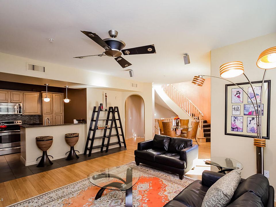 Highly sought after interior corner unit at The Villages at Aviano, upgraded throughout with many extras. Hardwood floors in main living area, Samsung four door French door refrigerator, tile backsplash, ASKO washer and dryer, granite countertops, wired for surround sound. Spa tub in master suite, huge walk in closet, plantation shutters throughout. Balcony off great room, two car garage wired for workspace. Water softener, wall of storage cabinets in garage, excellent storage throughout unit. Tile floor in bathrooms, carpeting in master bedroom. Located in the center of Desert Ridge, it includes access to pool at complex as well as pool/gym/and community center of Aviano.